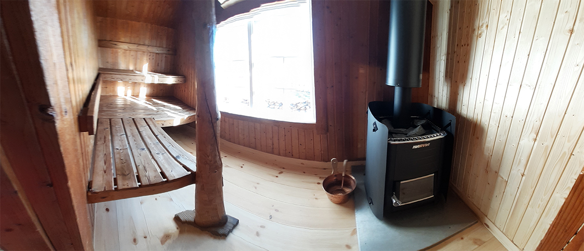 med sittgrupp inomhus, vedeldad bastu med fönster samt dusch/wc.